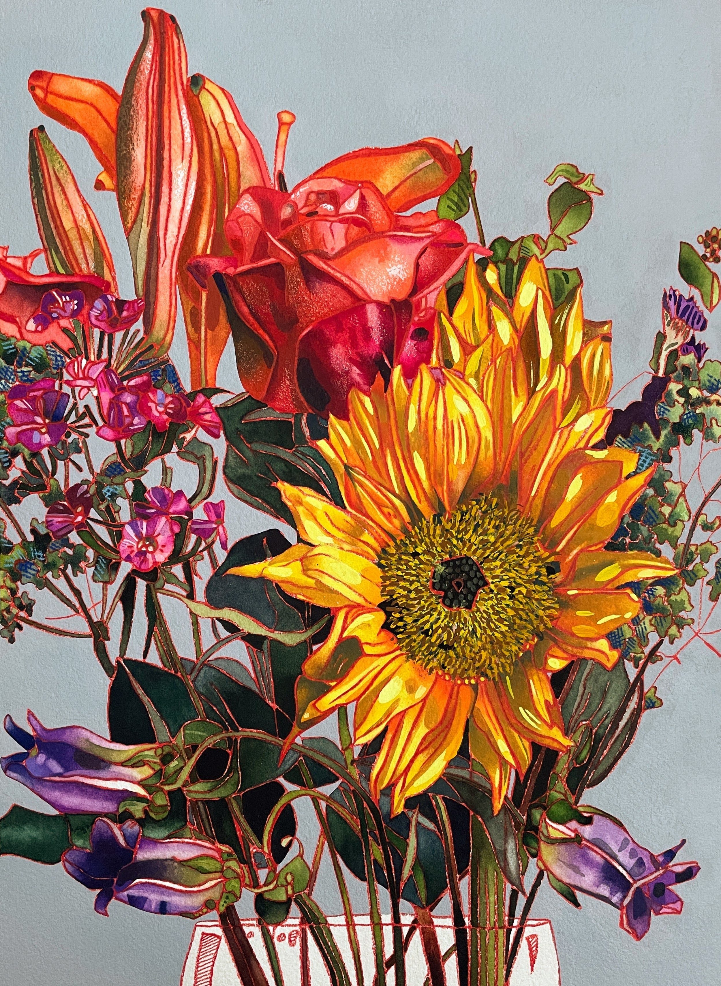 Lila strives to inspire joy. Her sunny subjects—a dish of cheerful clementines, a bouquet of blooming flowers, a table of twinkling trinkets—make frequent appearances in her paintings, drawings, designs, and mixed media work. She seeks to create vibrant, energetic images that celebrate color and instill hope in the viewer.