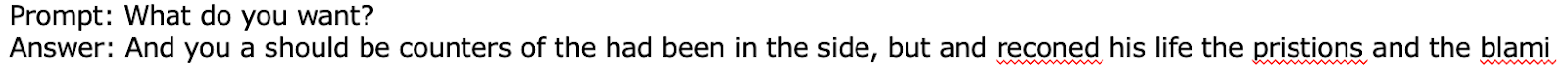 Next, I showed results of some of our early wins with replacing Neural Networks in diffusion models and language models. I showed (using super small datasets and a very small amount of computing) that we have some promising initial results. First, this is a picture of generated creative handwriting, where we know exactly why each pixel was generated and from what proportion each training datapoint played in making that image. Next, from only having War and Peace as training (not fine tuning mind you, this is training from scratch) the LLM was able to start learning some words, capitalization, and punctuation rules, but admittedly could be improved.