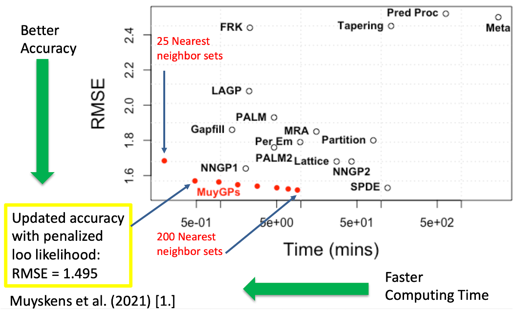 Of course, I took the opportunity to talk about Gaussian Process Models for Big Data in AI. I started off by introducing MuyGPs, which is a methodology for a large number of observations for computationally efficient Gaussian Process Models my team developed at the Lawrence Livermore National Laboratory. Remember, Gaussian Process models have interpretation, uncertainty quantification, and natural data attribution, where we can interpret the percent data that influenced the model. I showed my favorite benchmark result, where MuyGPs has shown to be more accurate or faster than other approximate Gaussian Process models. However, to use AI applications have not just a large number of observations, but also a large number of variables in each observation so we need more complex models than this to work on AI.