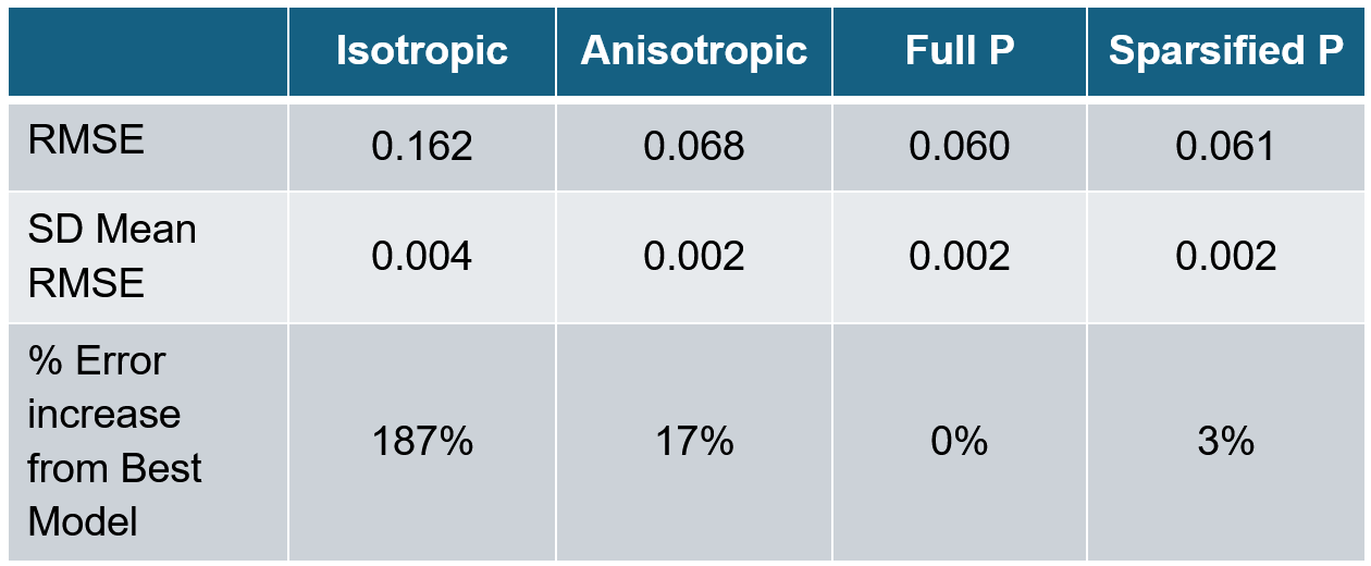 Finally, I discussed the variable selection model that I have been working on. I showed some very early results that we can make an improved model that (Sparsified P below), where we get improvement over the models that everyone first (isotropic, anisotropic) but have WAY fewer parameters than the “Full P” method. Essentially, this means I get more accurate solutions with only a little more computing time and complexity than more basic GP models on this benchmark dataset.